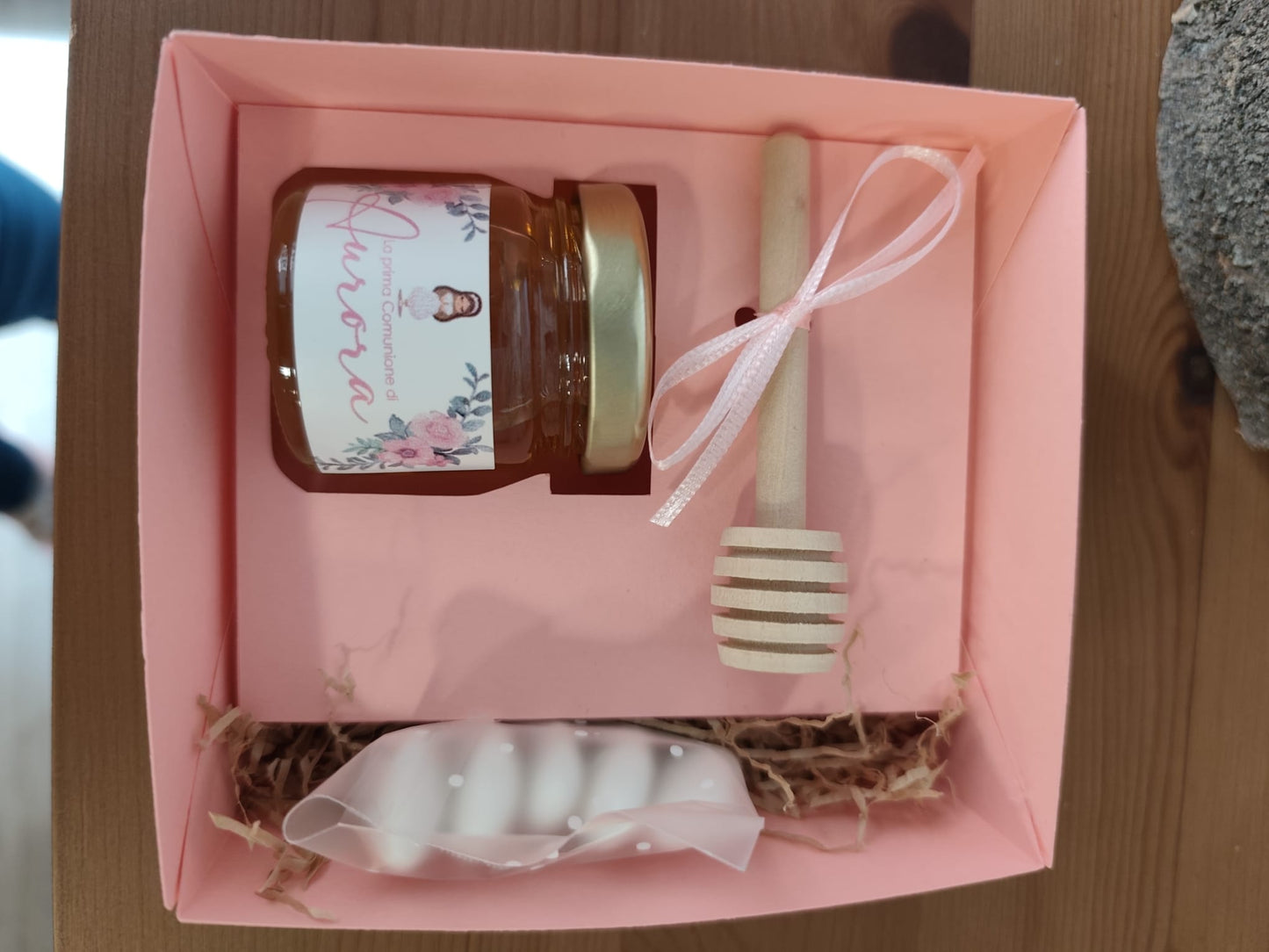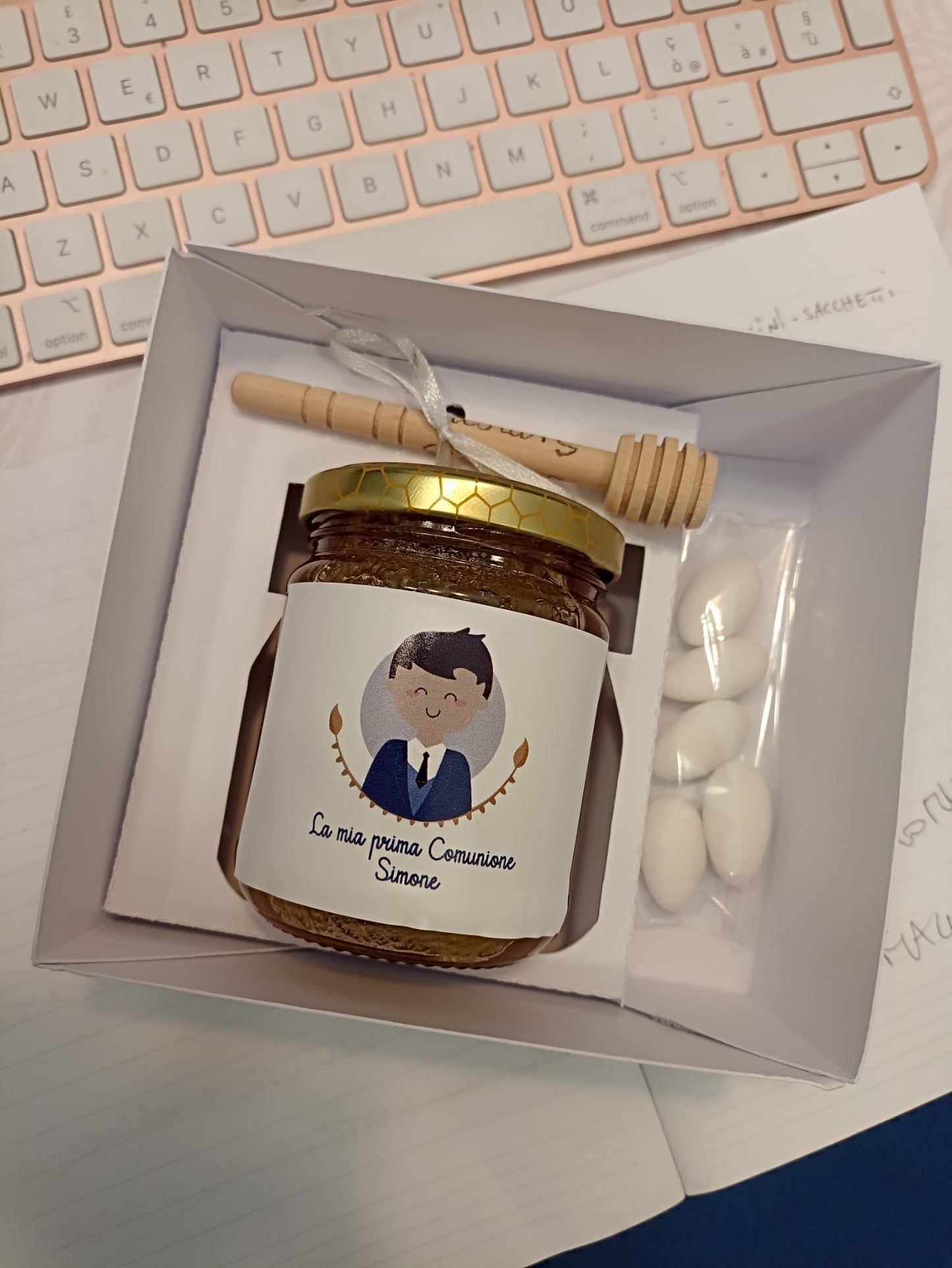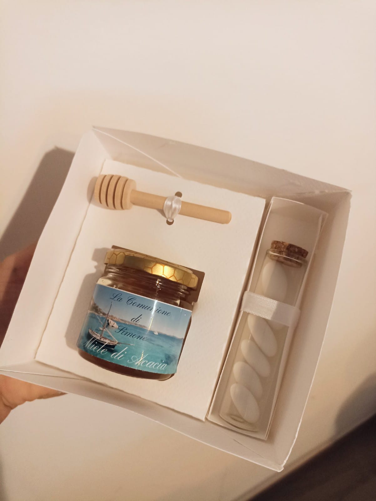 Bomboniera composta da una scatolina personalizzata contenete il barattolino del miele, lo spargimiele e i confetti