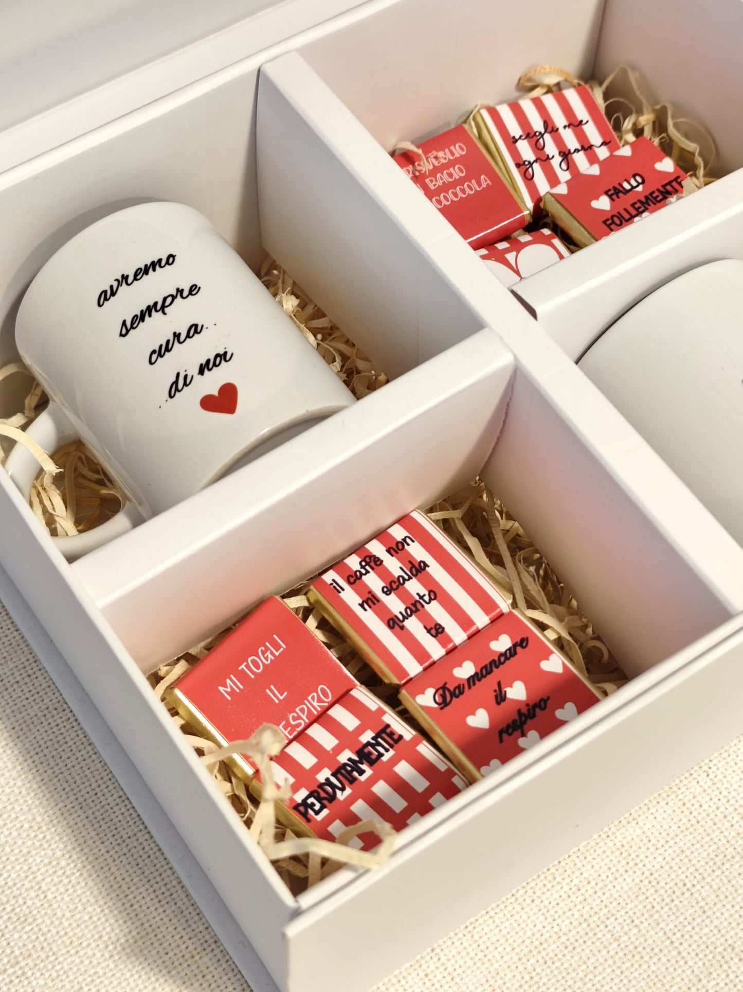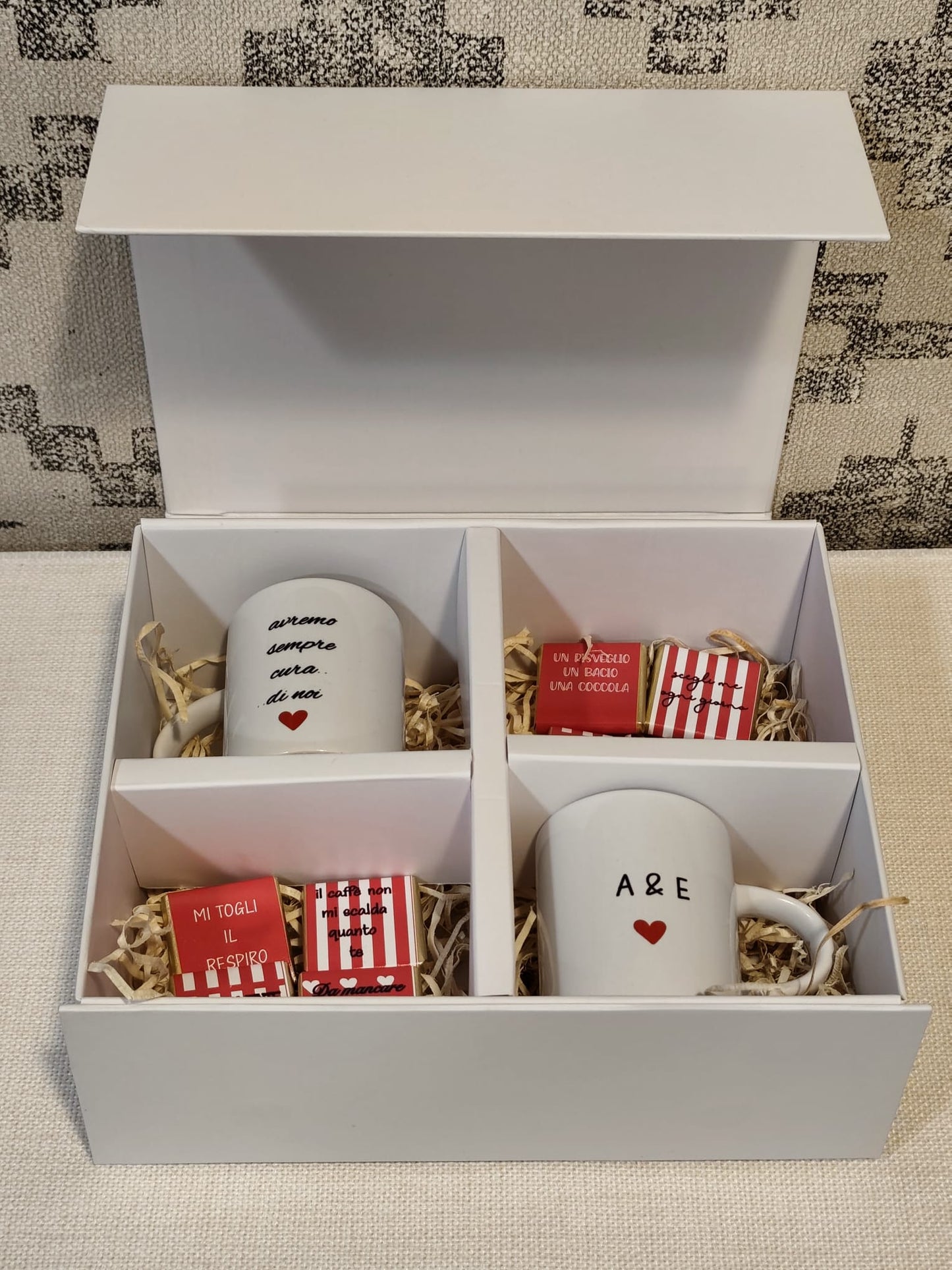 Box con chiusura magnetica contenente 2 tazzine da caffè personalizzate e 8 cioccolatini