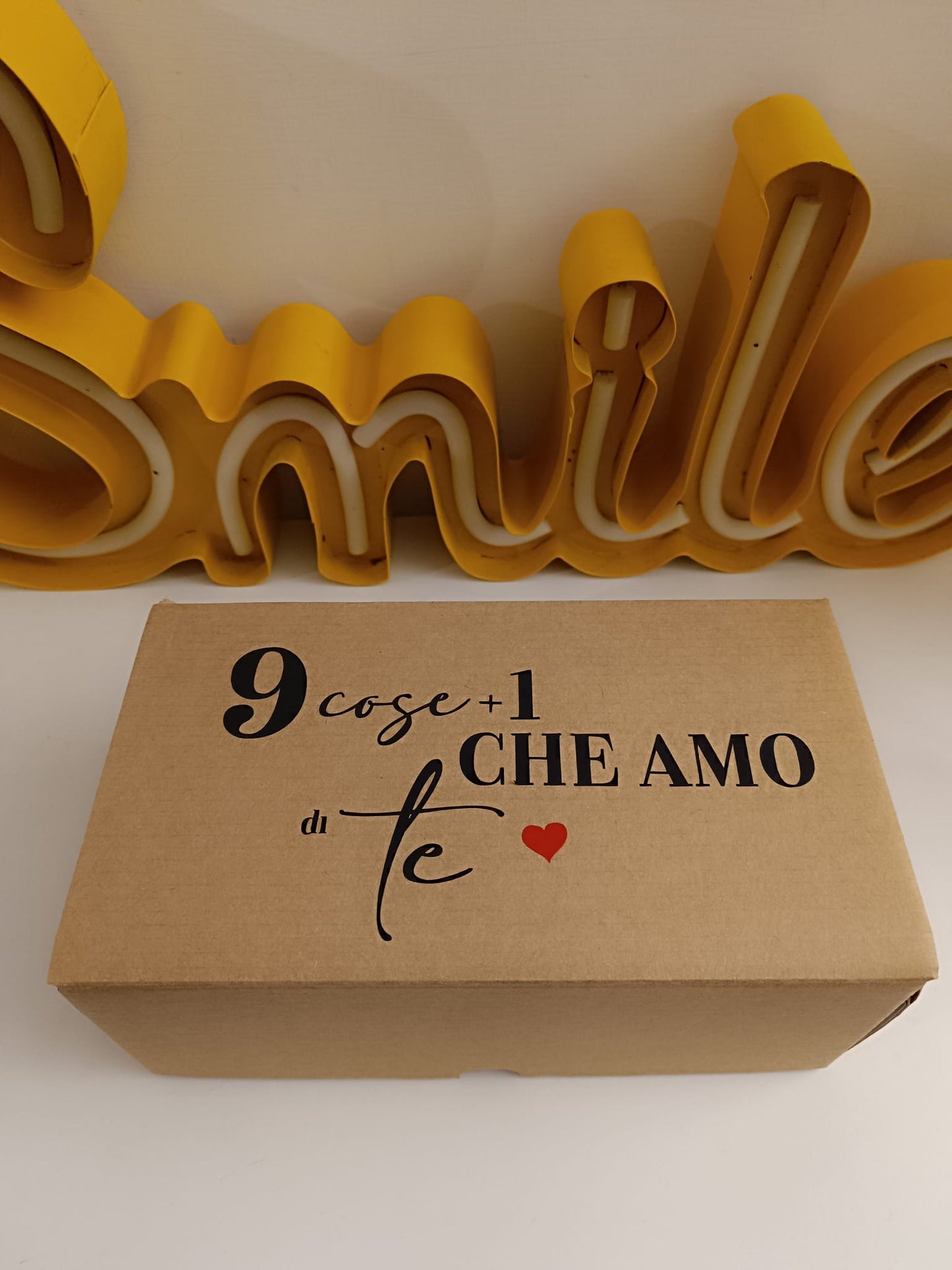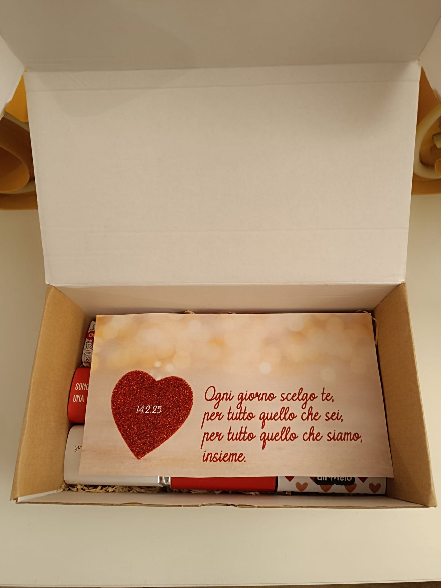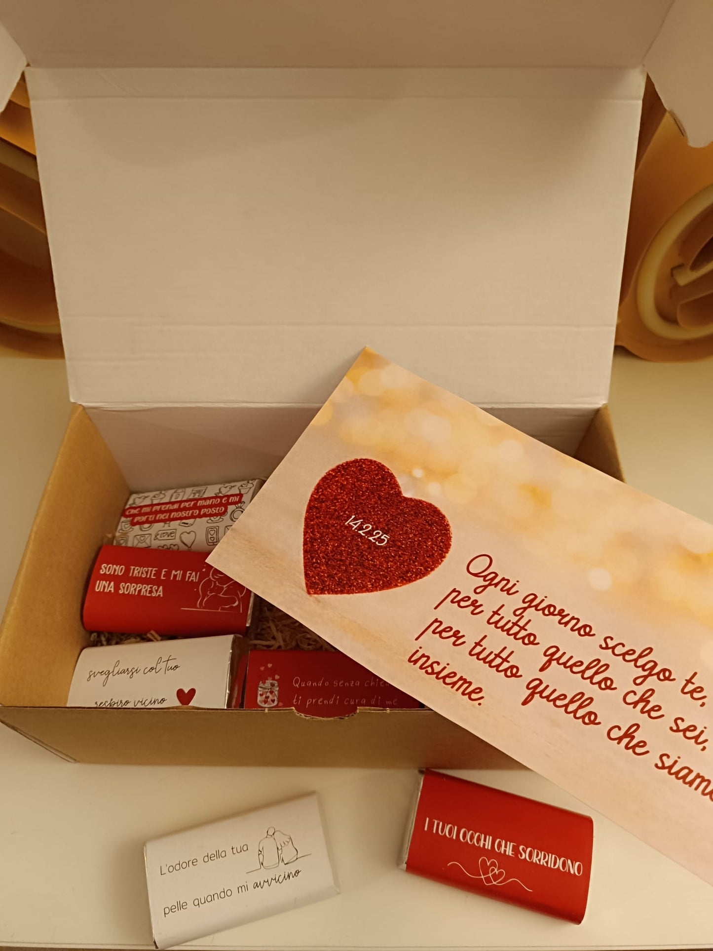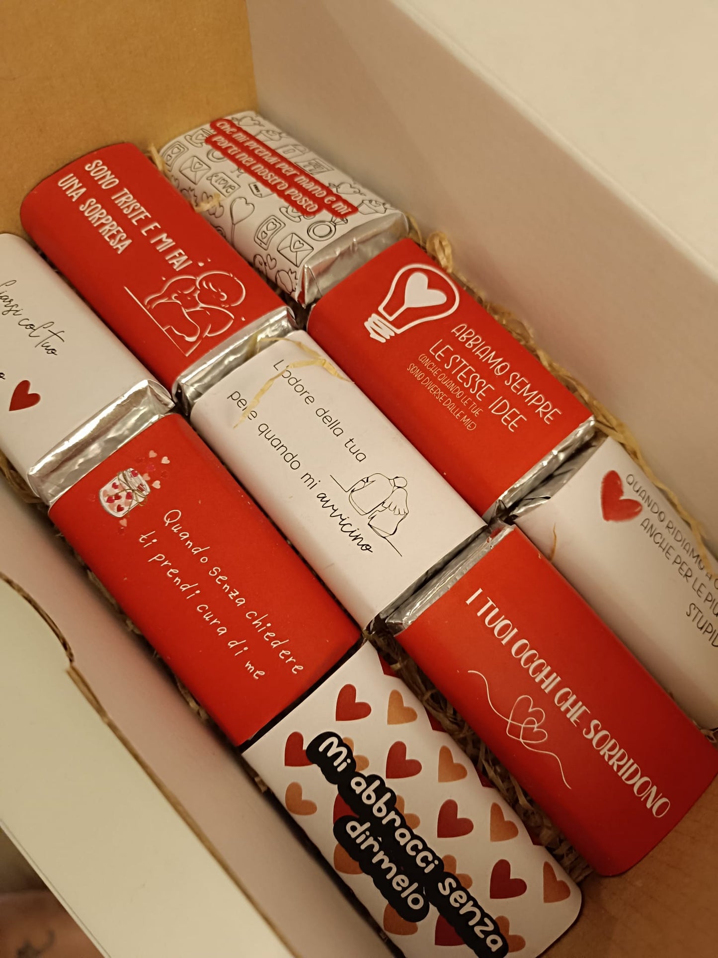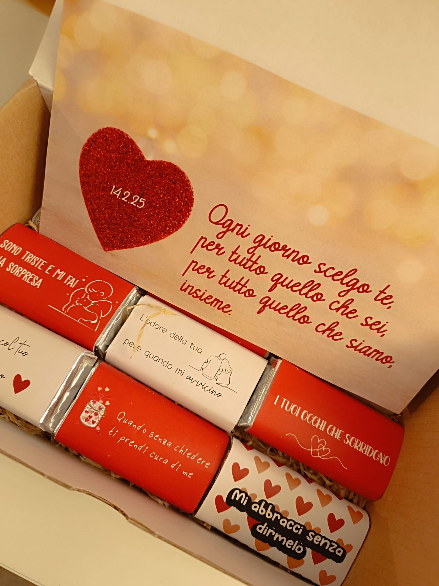 Scatola in carta kraft con all'interno 9 mini cioccolate da 25 gr l'una e un bigliettino.