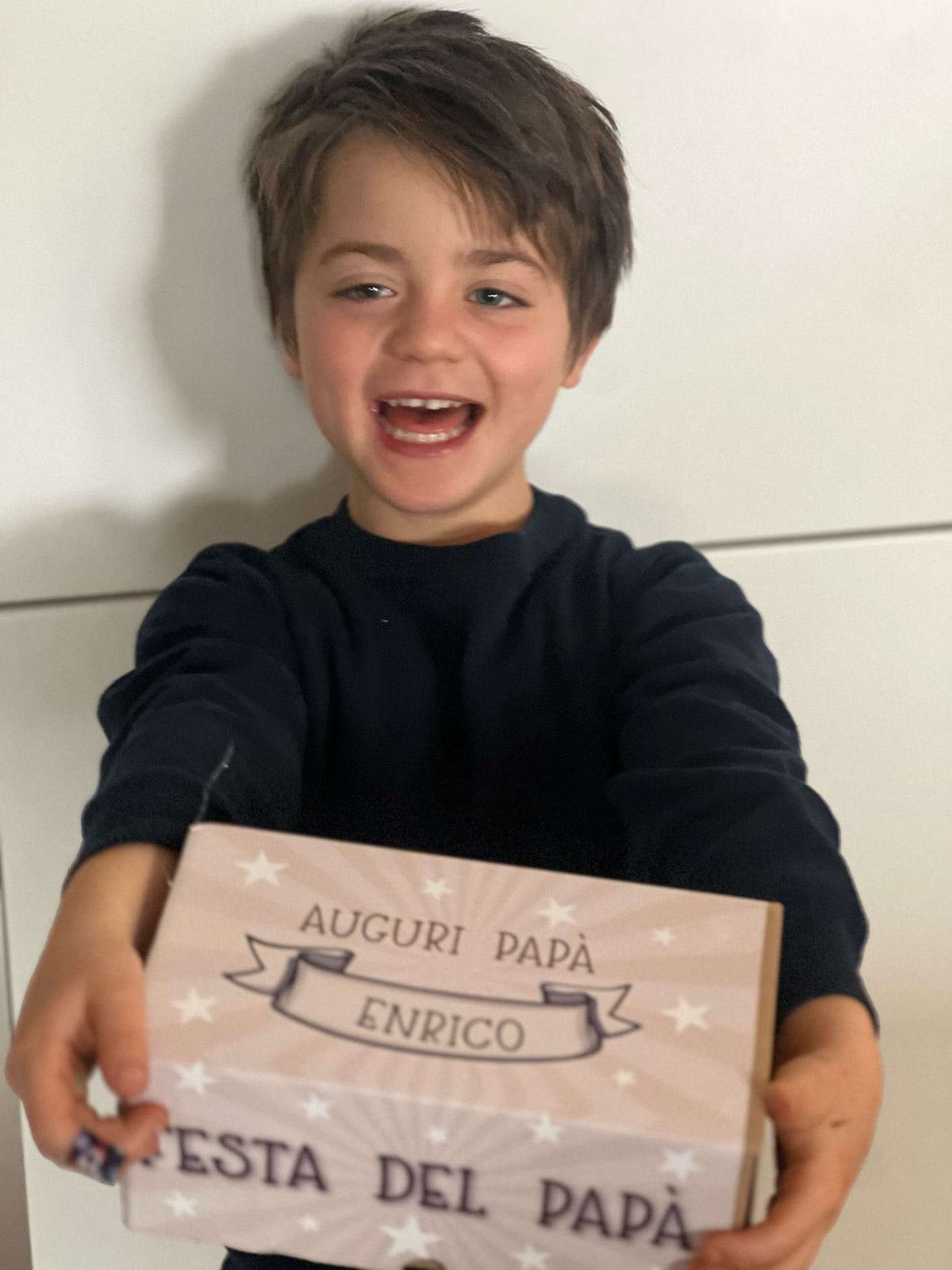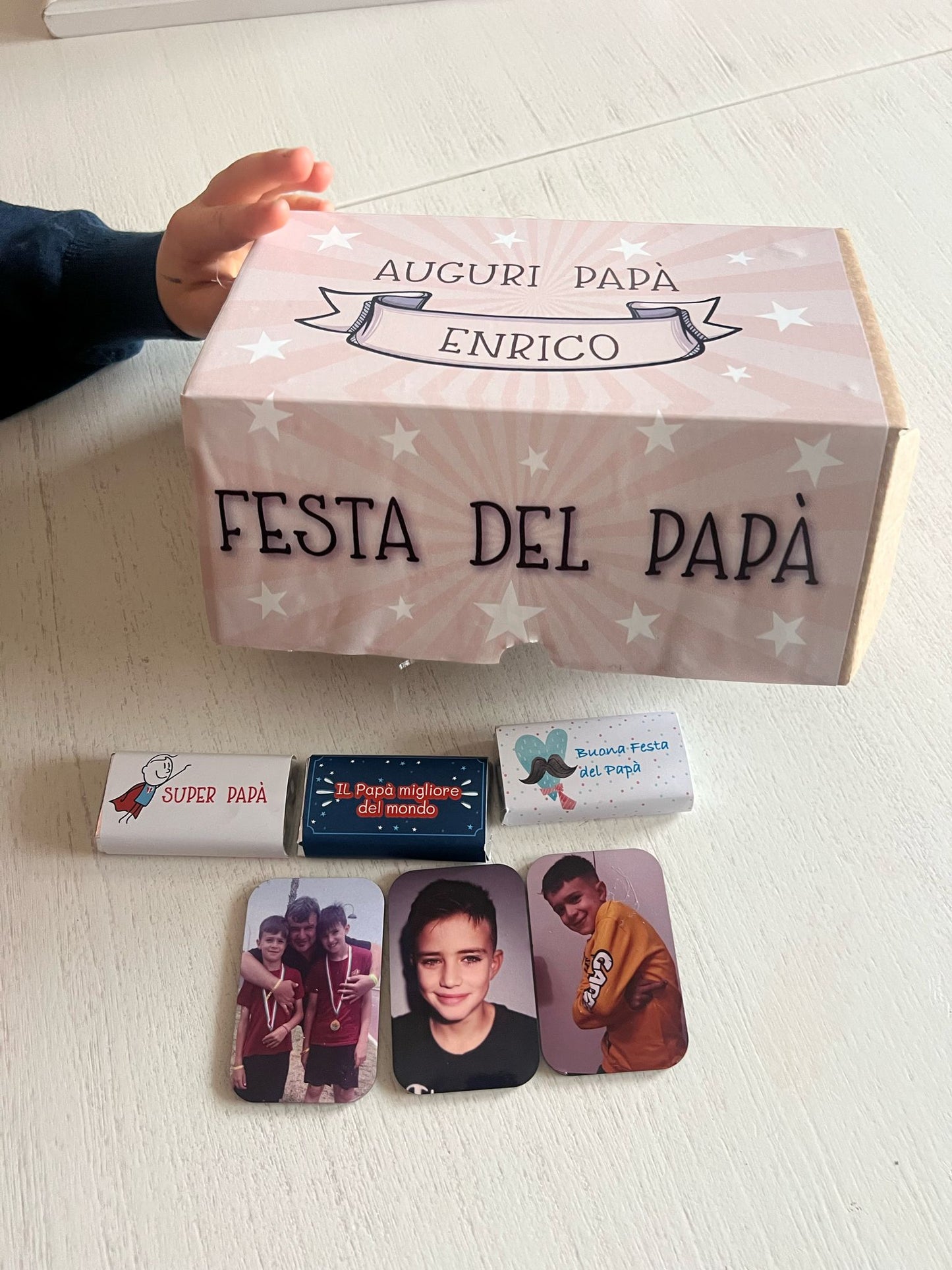 Scatola personalizzata per il papà, contiene 3 calamite con foto e 3 cioccolate.