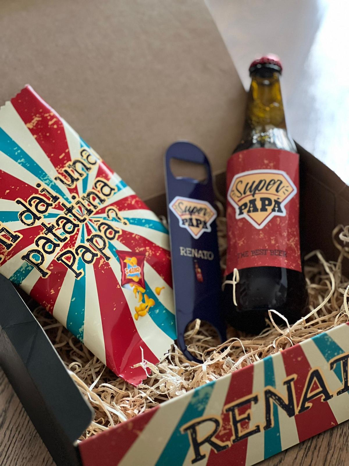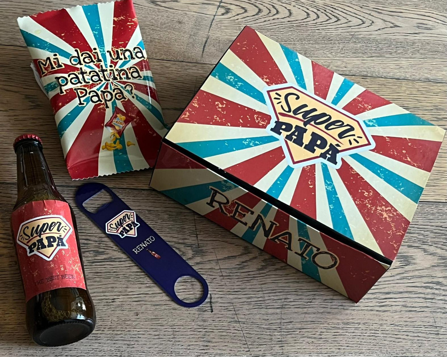 La box aperitivo per papà, comprende un pacchetto di patatine, una birra e un apribottiglie personalizzato.