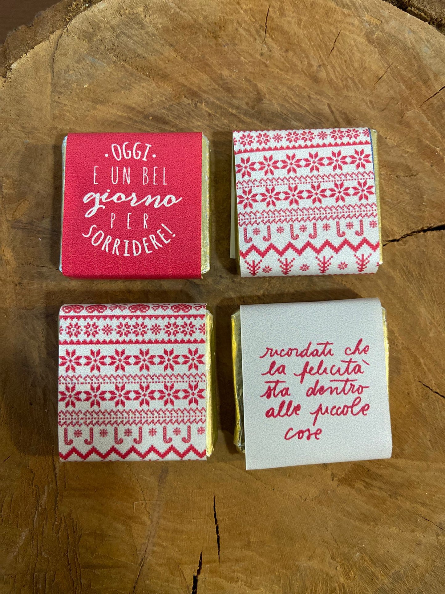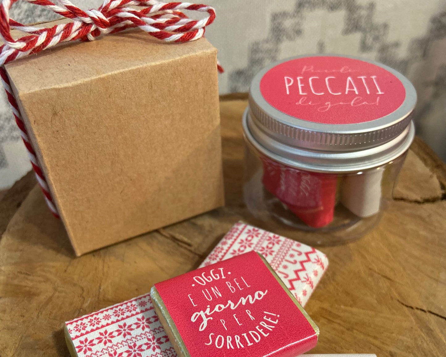 Barattolino in plastica con tappo personalizzato, contenente 4 cioccolatini con diverse grafiche e scatolina in cartoncino kraft con cordoncino natalizio.
