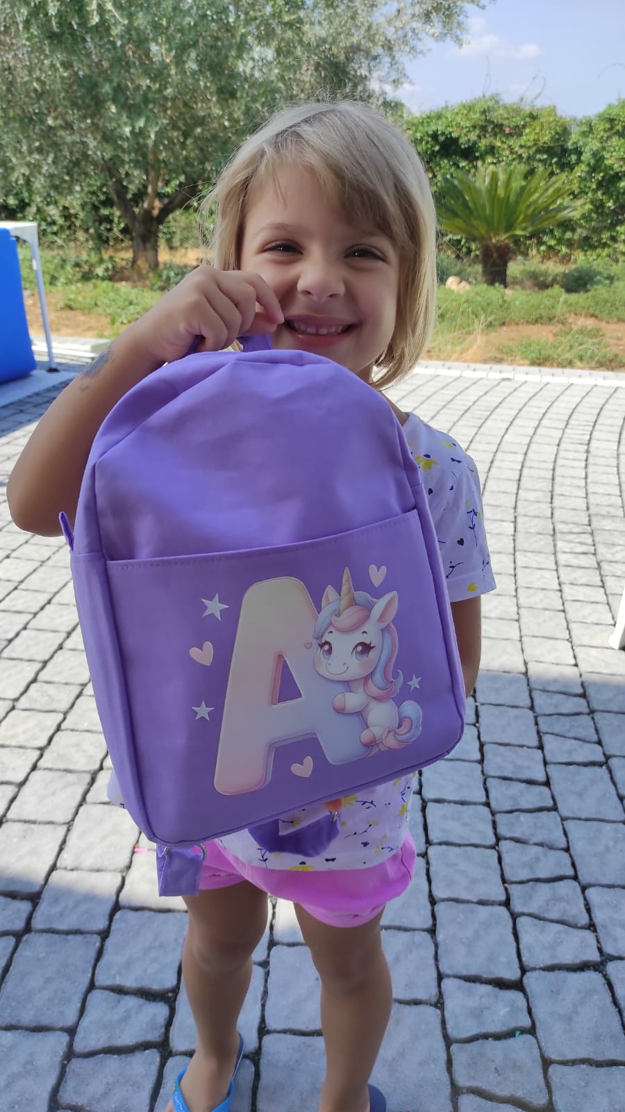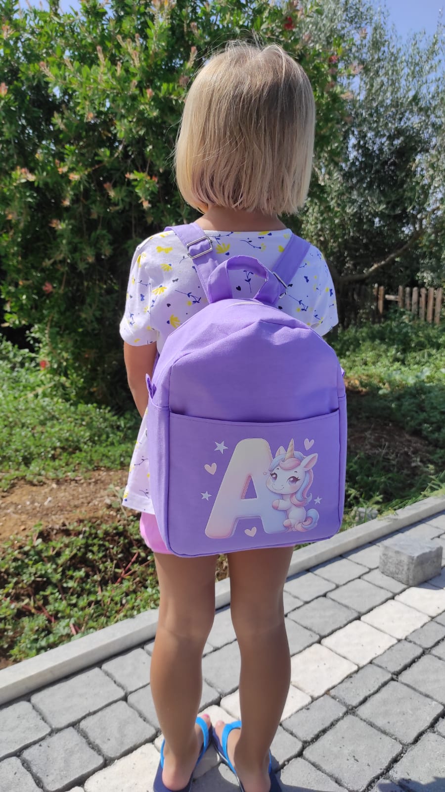 Zaino lilla in cotone con iniziale e unicorno